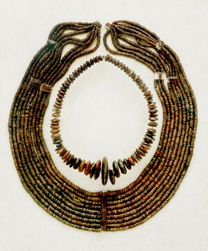 Wahrscheinlich wurde nur jede zweite Bohrung des großen Schiebers belegt, sodass die Perlenstränge auf einer Ebene arrangiert werden konnten. Die „leeren“ Bohrungen hätten dann dekorativen Zwecken gedient. Wie das sehr lange Collier getragen worden wäre, lässt sich nicht rekonstruieren. Seine Herstellung dürfte zwei bis drei Wochen in Anspruch genommen haben.[6]