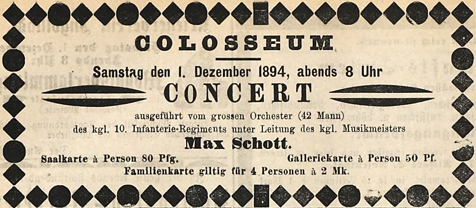Anzeige zu einem Konzert des Max Schott im Ingolstädter Tagblatt vom 30.11.1894 (Bayerische Staatsbibliothek München, 4 Eph.pol. 40 d-1894,2, Einzelbild 1062)