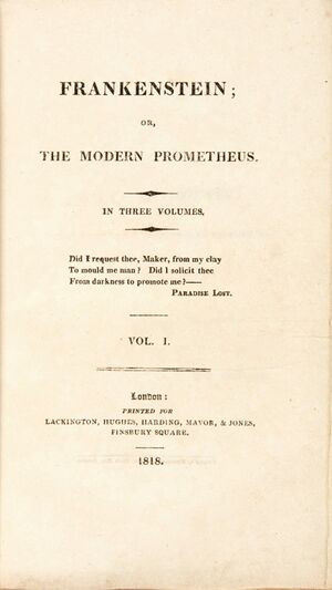 - Frankenstein or The Modern Prometheus, 3 vols. (London: Gedruckt von Lackington, Hughes, Harding, Mavor, & Jones, 1818). Erstausgabe.