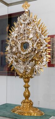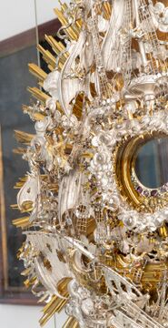 Die Schaufläche, die durch zahlreiche figürliche Darstellungen aus Silber geschmückt ist und in deren Mitte man das aus Kristall und Glas bestehende Herzstück der Monstranz sehen kann, wird von einem vergoldeten Strahlenkranz aus Messing umrahmt. Gekrönt wird sie nicht wie für derartige Monstranzen üblich von einem Kruzifix, sondern von vier rechtwinklig zueinanderstehenden, spiralförmigen Einrollungen (Voluten), die sich entgegen dem Uhrzeigersinn aufrollen und die von Strahlen umrahmt werden. So werden Assoziationen einer Kreuzblume oder Sonne geweckt.[13]